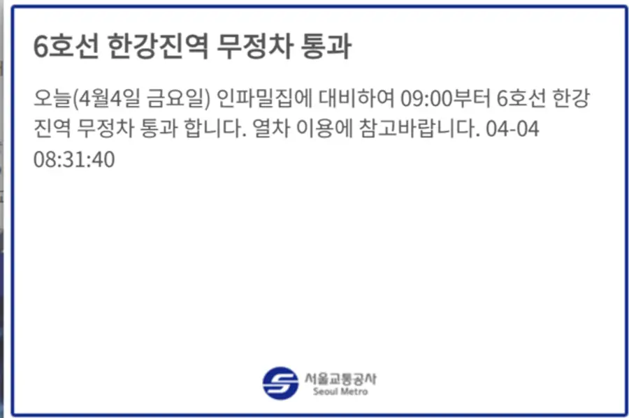 서울교통공사는 4일 오전 8시31분 인파밀집에 대비, 오전 9시부터 6호선 한강진역 무정차 통과한다고 안내했다.