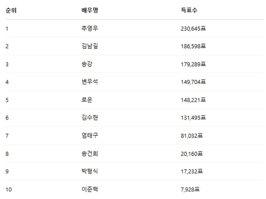 이번 투표는 ‘대사 전달력’이라는 특별한 주제를 통해 배우들의 연기 감성과 팬심이 교차된 결과였다. 추영우는 세 주 연속 1위를 기록하며 대세 배우임을 입증했으며, 김남길, 송강 등 깊은 감정 연기를 보여주는 배우들이 강세를 보였다.