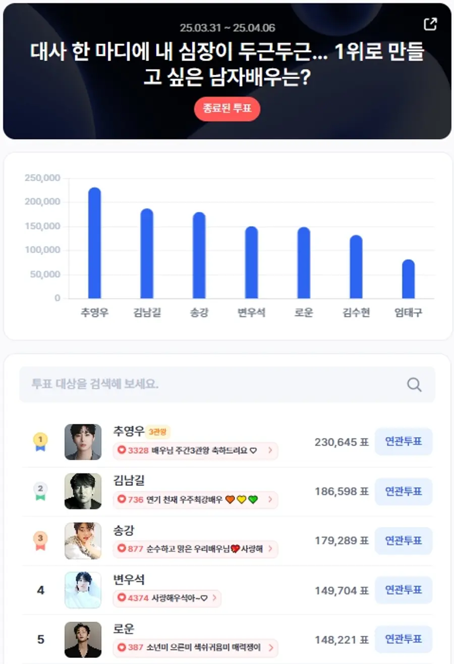 이번 투표 주제는 “대사 한 마디에 내 심장이 두근두근… 1위로 만들고 싶은 남자배우는?”으로, 섬세한 감정 연기와 설레는 대사 전달력이 뛰어난 배우들이 상위권에 올랐다.