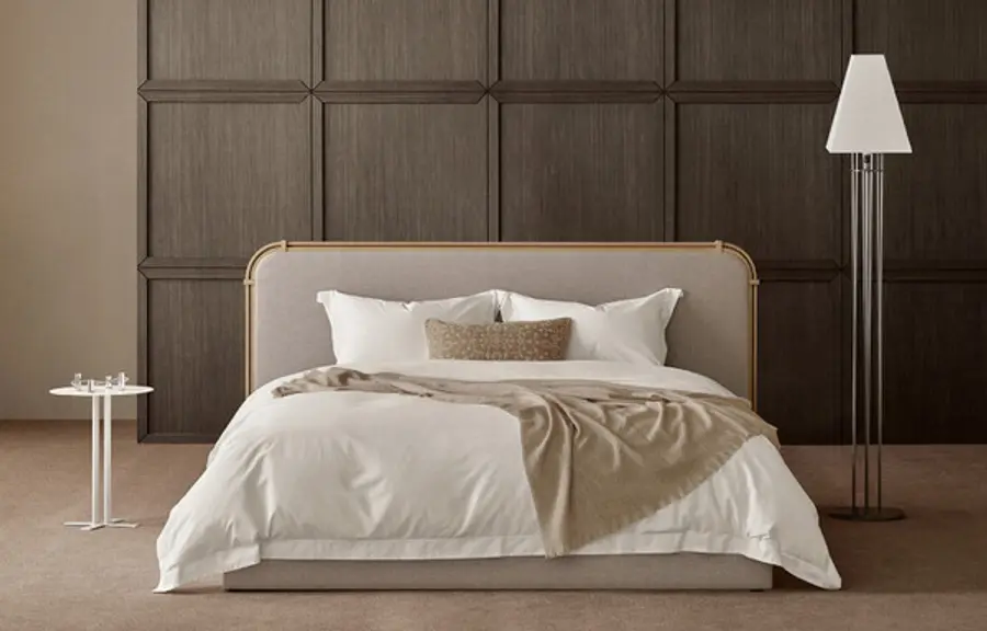 아르데코 양식의 대칭적 구조와 우드 소재로 제작돼 우아한 고급스러우면서도 내추럴한 느낌을 준다. 프레임은 뉴트럴 그레이 색상으로, 볼드 스트라이프·빅 플라워·다이아몬드 등 다양한 패턴이 조합됐다. 넓은 헤드보드는 쿠션감을 더해 공간감과 편안함을 강화했다. 모와 린넨이 함유된 반복적인 사선 패턴의 원단은 클래식한 느낌과 더불어 조명이나 보는 각도에 따라 다채로운 매력을 발산한다.
