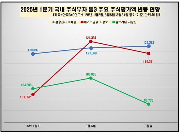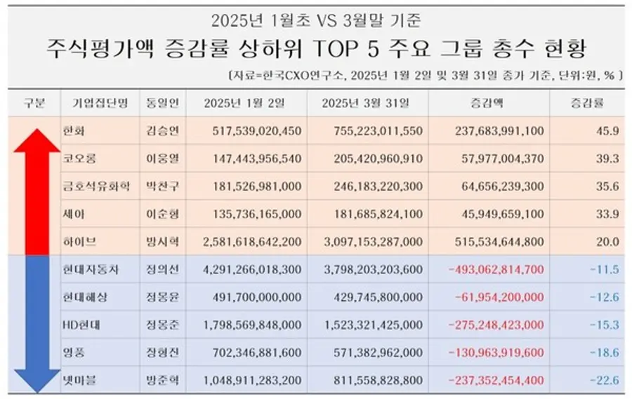 기업분석전문 한국CXO연구소는 9일 이 같은 내용을 골자로 한 ‘2025년 1분기(1월 초 대비 3월 말 기준) 주요 그룹 총수 주식평가액 변동 조사’ 도출 결과를 발표했다.