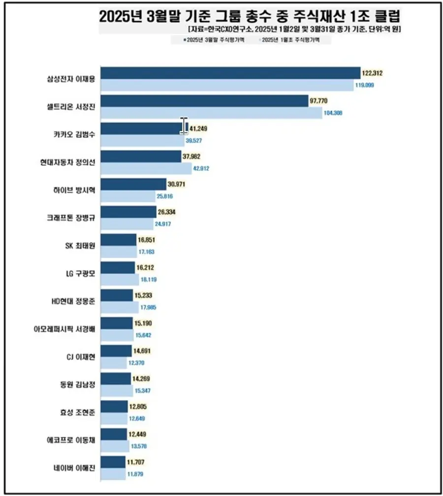 이외 ▲7위 최태원 SK 회장(1조 6851억 원) ▲8위 구광모 LG 회장(1조 6212억 원) ▲9위 정몽준(HD현대) 아산재단 이사장(1조 5233억 원) ▲10위 서경배 아모레퍼시픽 회장(1조 5190억 원) ▲11위 이재현 CJ 회장(1조 4691억 원) ▲12위 김남정 동원 회장(1조 4269억 원) ▲13위 조현준 효성 회장(1조 2805억 원)▲14위 이동채 에코프로 창업자(1조 2449억 원) ▲15위 이해진 네이버 이사회 의장(1조 1707억 원)도 올 1분기에 주식재산 1조 클럽에 합류한 것으로 파악됐다.