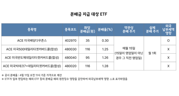한국투자신탁운용은 월중 배당 ETF별 4월 분배금 내역을 11일 공지했다.