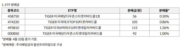 미래에셋자산운용은 월중 배당 ETF 4종의 4월 분배금 내역을 11일 공지했다.