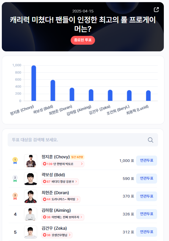 곽보성(Bdd)은 590표를 얻으며 2위에 이름을 올렸다. “비디디 항상 응원!!”이라는 짧은 문구에서 보이듯, 오랜 시간 꾸준함으로 롤판을 지켜온 그의 팬덤은 여전히 두텁다. 곽보성은 전통 강호팀으로 복귀해 다시 한번 LCK 상위권 진입을 노리고 있다.