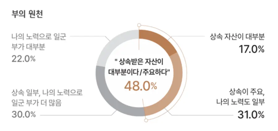 결혼한 지 3년 미만의 부유층 신혼부부 가운데 48%는 부의 원천으로 상속에 꼽았다. 노력으로 일군 부가 대부분이란 응답은 22%였다. 30%가 상속은 일부이고, 노력으로 부의 대부분을 일궜다고 답했다.