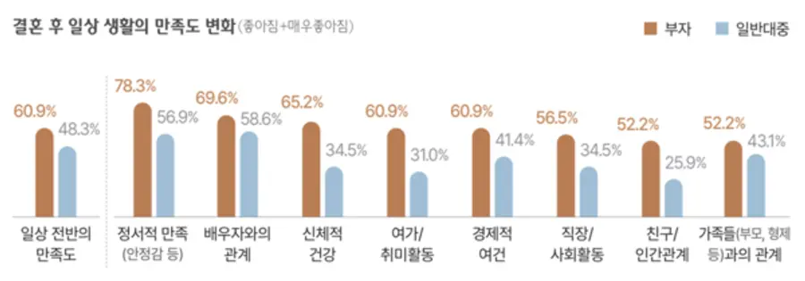 결혼 후 만족도 조사에서 부자는 9개 항목 모두 대중보다 더 높은 만족도를 드러냈다. 부자의 61%는 일상 전반의 만족도가 좋아졌다고 답했다. 반면 대중은 48%만 그렇게 느꼈다.