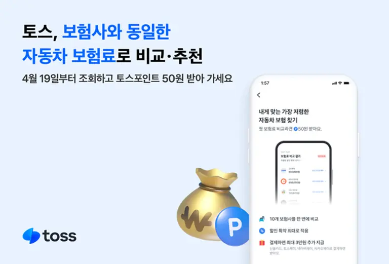 ‘차 보험 비교하기’ 서비스에서 보험료를 조회하면, 최초 1회에 한해 토스포인트 50원을 지급한다. 신차 구매자와 보험 갱신 대상자, 4월 21일 이전에 보험 비교·추천 서비스를 이용한 사용자 모두 대상이다.