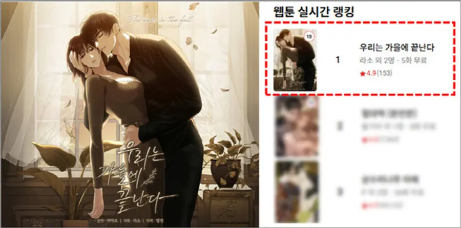 ‘우리는 가을에 끝난다’는 공개 직후인 지난 22일 리디북스 실시간 웹툰 랭킹 1위에 오르며 성공적인 출발을 알렸다. 플랫폼 리디에서 화요일 정기 웹툰 라인업에 합류해, 매주 연재할 예정이다.