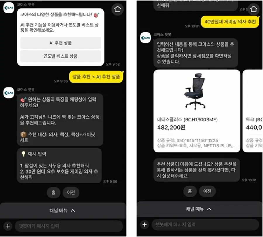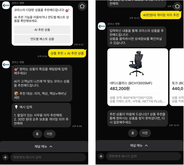 |스마트투데이=한민형 기자| 사무가구 전문 기업 코아스(대표 민경중)가 고객 중심 서비스 기업으로의 전환을 위해 AI 활용 및 서비스 개발에 박차를 가한다. 코아스는 최근 생성형 AI 기반 ‘코아스 CS 챗봇’을 카카오톡 채널에 런칭하고, 고객 문의에 실시간으로 응답하는 AI 서비스를 구축했다고 25일 밝혔다.