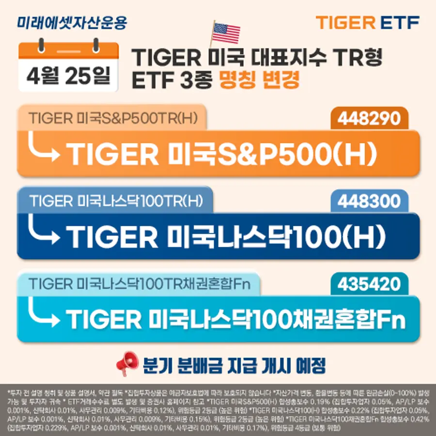 이날부터 TR(토탈리턴)형 해외 ETF인 ‘TIGER 미국S&P500TR(H) ETF(448290)’, ‘TIGER 미국나스닥100TR(H) ETF(448300)’, ‘TIGER 미국나스닥100TR채권혼합Fn ETF(435420)’은 종목명에서 ‘TR’ 표기를 삭제한다.