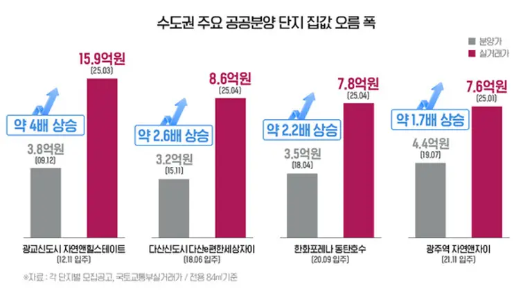 |스마트투데이=이재수 기자| 분양가상한제가 적용돼 합리적인 분양가로 내 집 마련의 기회를 제공했던 공공분양 아파트가 두드러진 가격 상승세를 보이면서 수요자들의 관심이 커지고 있다. 실제 주요 신도시 공공분양 아파트는 분양가 대비 '수억 원' 이상 오른 가격에 거래되고 있는 것으로 나타났다.