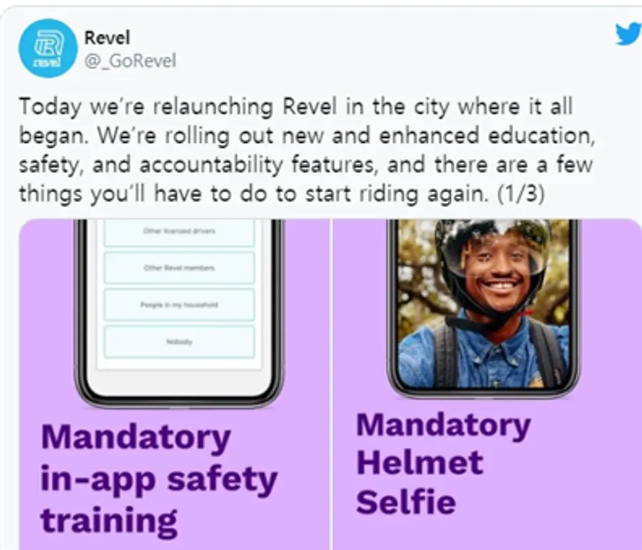 그런데 리벨이 이번에 한 달도 안 돼 새로운 안전 요건을 갖추어 뉴욕시로 돌아왔다고 스마트시티다이브가 전했다. 리벨은 트위터를 통해 뉴욕 시에서 서비스를 재개하며 이제부터는 라이더들이 차량에 접근하기 위해 안전 교육을 이수해야 하고, 탑승을 시작하기 전에 헬멧을 착용하는 셀카를 찍어야 한다고 트윗했다.