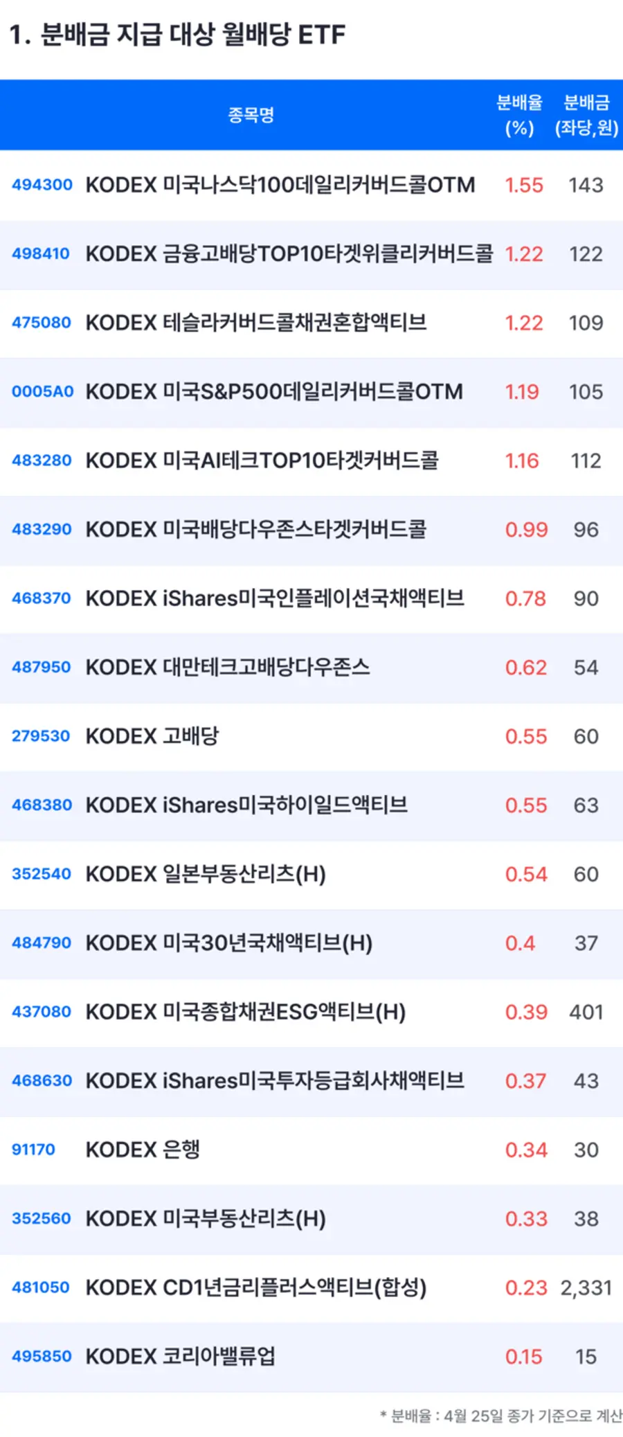 KODEX테슬라커버드콜채권혼합액티브는 좌당 109원(1.22%), KODEX미국S&P500데일리커버드콜OTM은 좌당 105원(1.19%)을 지급한다.