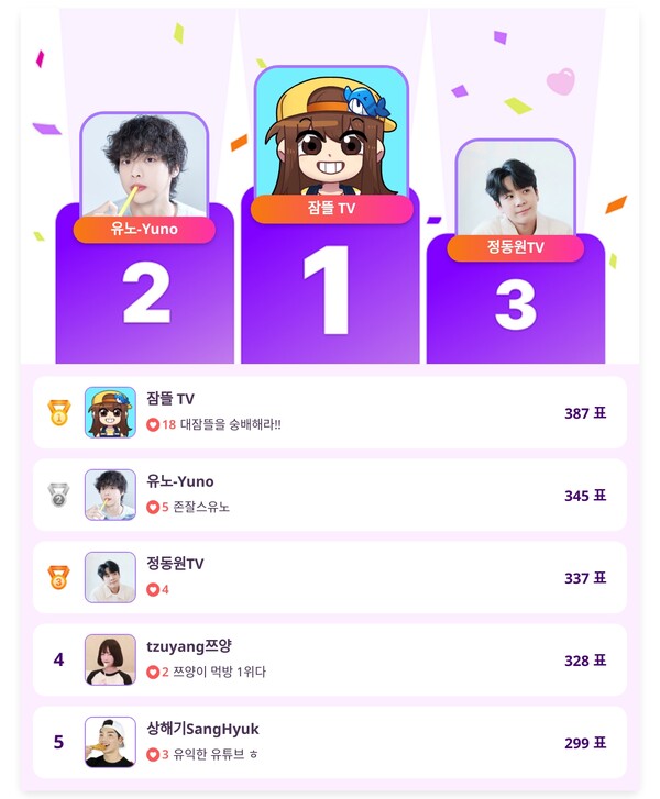 3위는 정동원TV(337표), 4위는 tzuyang쯔양(328표), 5위는 상해기SangHyuk(299표)가 차지했다.