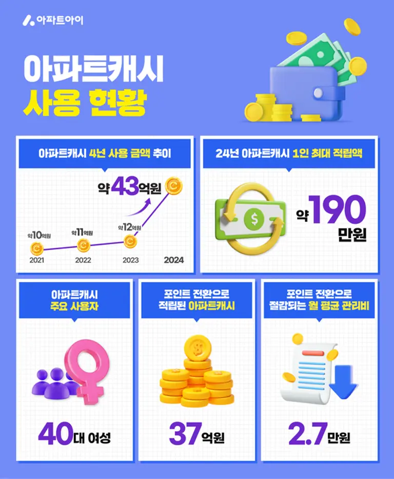 아파트 관리 플랫폼 '아파트아이'는 앱 내에서 '아파트캐시'를 적립하고 이를 관리비 결제 시 차감할 수 있는 서비스를 제공하고 있다. 아파트아이에 따르면 2024년 아파트캐시 사용 금액은 전년 대비 약 3배 이상 증가한 것으로 나타났다.