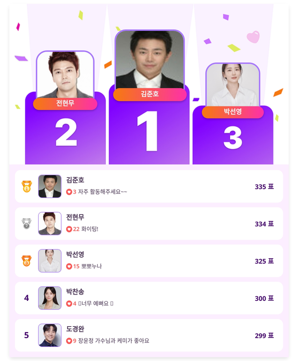 박선영이(325표) 3위에 안착했고, 4위 박찬송(300표)와 5위 도경완(299표)도 뒤를 이었다.