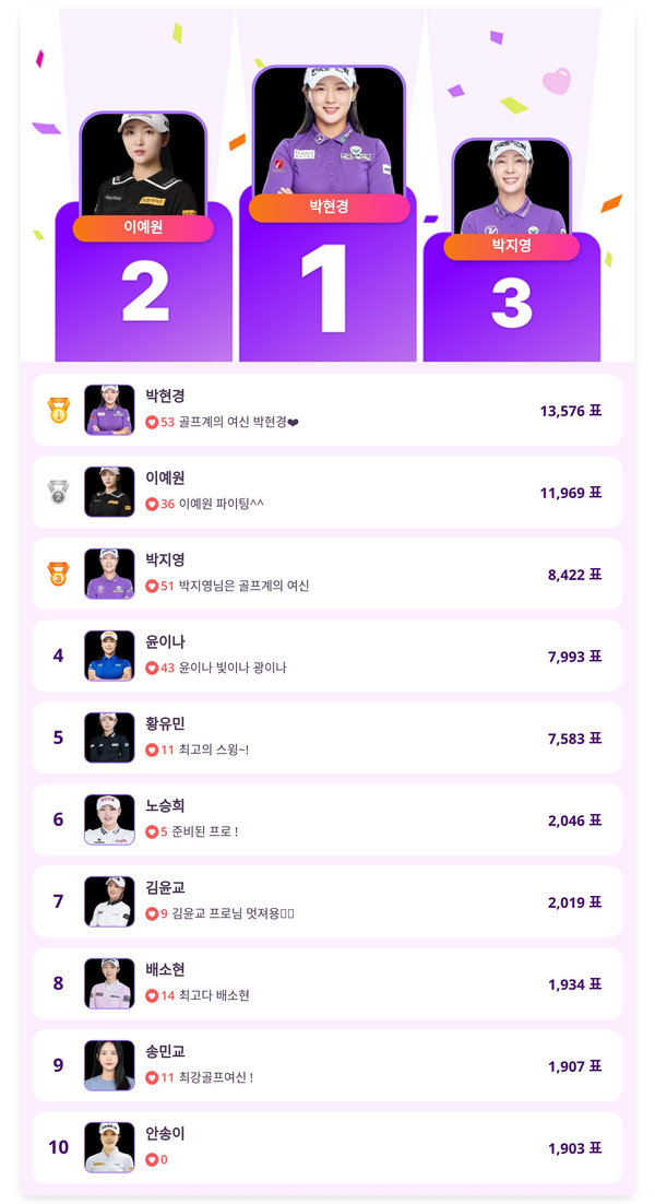 박지영이(8,422표) 3위에 안착했고, 4위 윤이나(7,993표)와 5위 황유민(7,583표)도 뒤를 이었다.