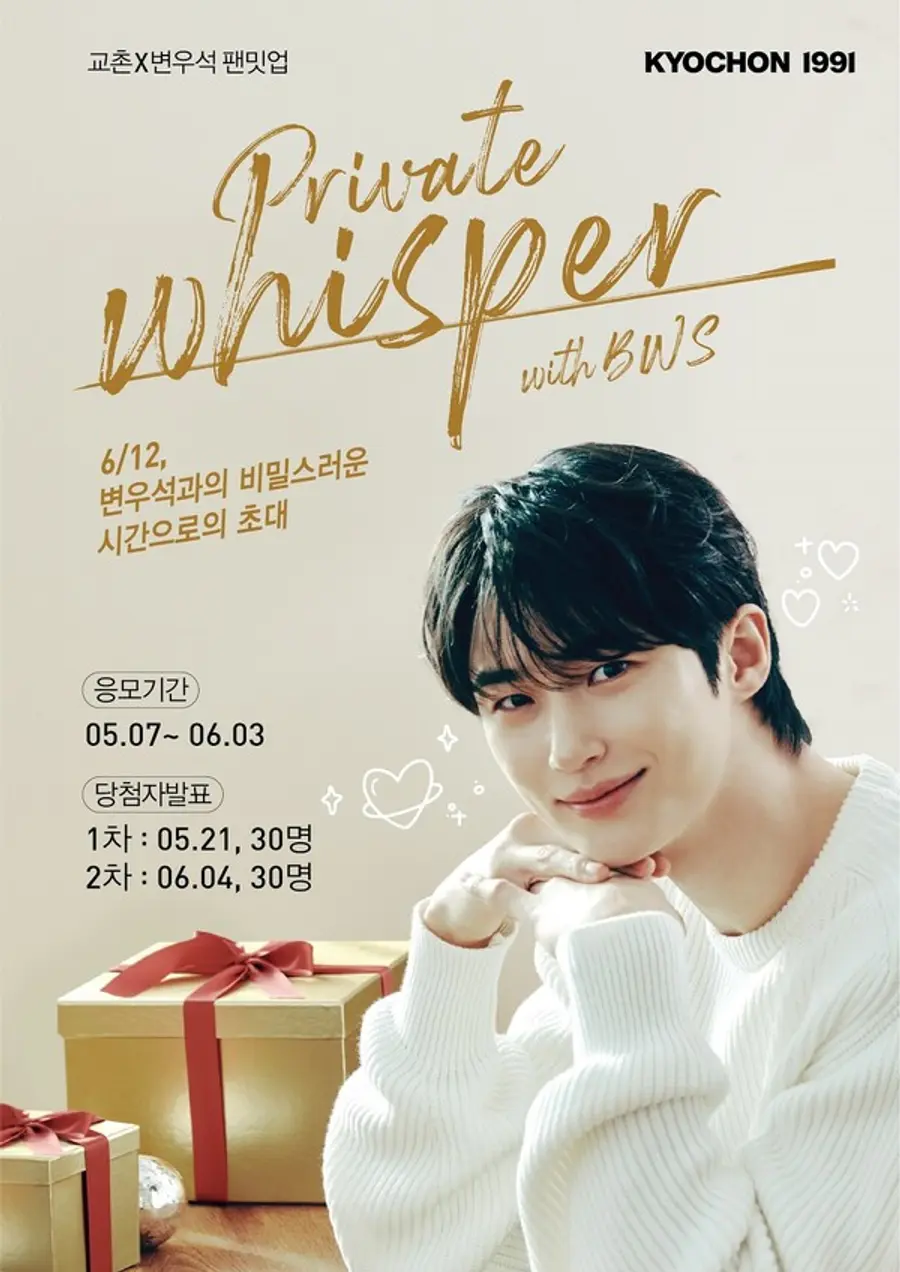 특히, 이번 팬밋업은 교촌의 창립 연도와 같은 1991년에 태어난 ‘교촌둥이’ 배우 변우석과 교촌 팬들이 직접 만나 소통할 수 있는 자리다. ‘Private Whisper(프라이빗 위스퍼)’라는 콘셉트 아래, 6월 12일 펼쳐지는 변우석과 함께하는 비밀스럽고 특별한 순간으로 고객들에게 잊지 못할 추억을 제공할 예정이다