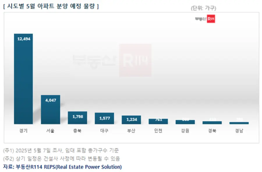 5월 주요 분양 단지로는 부산 강서구 강동동 ‘에코델타시티중흥S-클래스에듀리버(728가구)’, 대구 수성구 범어동 ‘어나드범어(604가구)’, 강원 춘천시 동면 ‘춘천만천리동문디이스트(569가구)’, 경북 안동시 용상동 ‘트리븐안동(418가구)’ 등이 분양을 앞두고 있다.