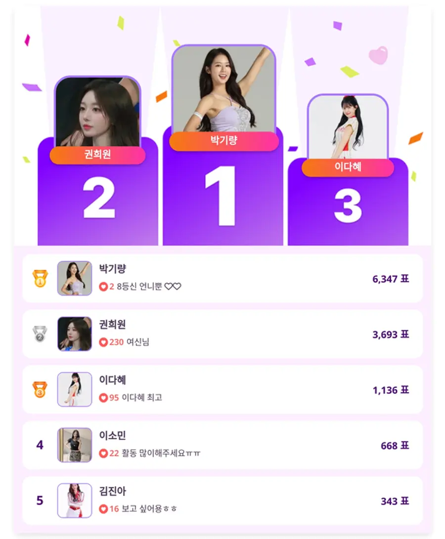 3위는 1,136표를 받은 이다혜, 4위는 668표의 이소민, 5위는 343표의 김진아가 차례로 이름을 올렸다. 팬들의 꾸준한 지지를 기반으로 상위권에 안착했다.