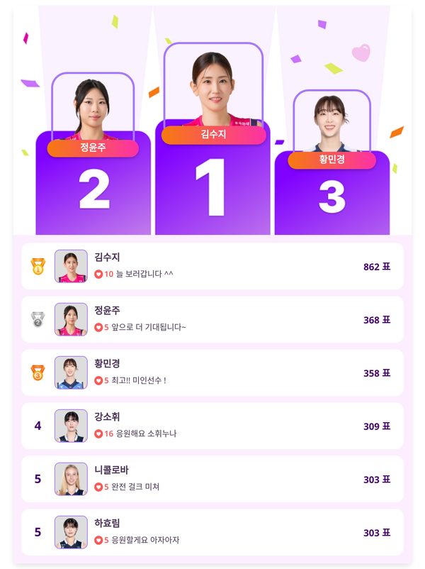 황민경은 358표를 받아 3위를 기록했다. 강소휘는 309표, 니콜로바는 303표로 각각 4위와 5위에 올랐다.
