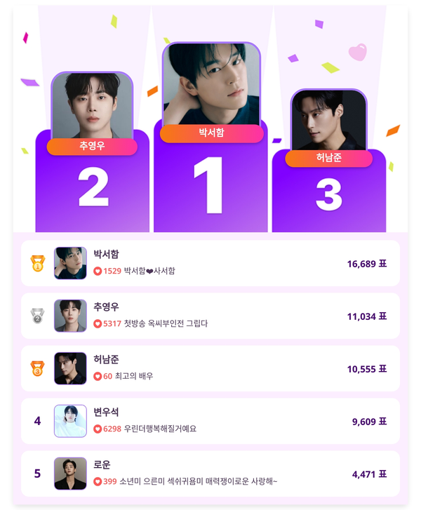 한편, 3위는 10,555표를 받은 허남준이 이름을 올렸으며, 4위와 5위에는 변우석(9,609표), 로운(4,471표)이 각각 자리했다.