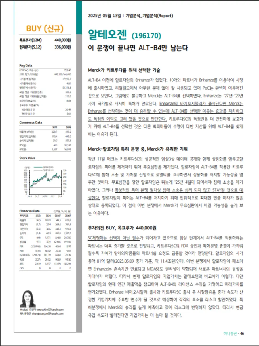 그는 "특허분쟁에서 머크의 승리를 높게 예측하고 있어 리스크에 반영하지 않았다"며 "(머크로부터의) 현금유입 속도가 빨라진다면 알테오젠의 기업가치는 더 높아질 것"이라고 밝혔다.