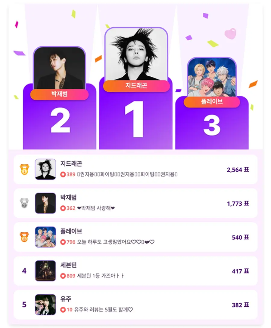 3위는 540표를 얻은 버추얼 아이돌 그룹 플레이브가 올랐다. 이어 세븐틴(417표), 유주(382표)가 각각 4위와 5위에 이름을 올렸다.