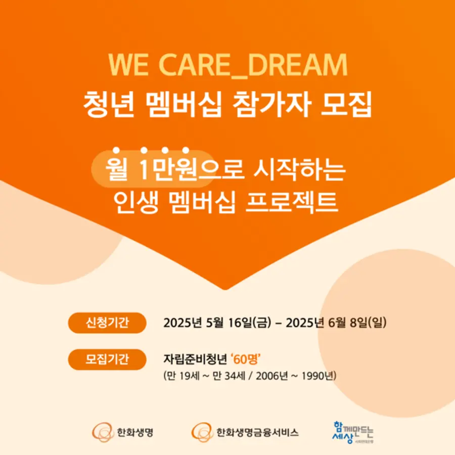 |스마트투데이=김윤진 기자| 한화생명이 함께만드는세상(사회연대은행)과 함께 전국의 자립준비청년을 대상으로 'WE CARE_DREAM' 청년 멤버십 2기 참가자를 모집한다고 16일 전했다.