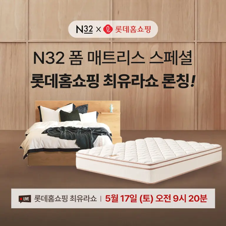 |스마트투데이=이재수 기자| 비건 매트리스 N32가 TV홈쇼핑에서 전격 데뷔해 상승세를 이어간다. N32는 오는 17일 오전 9시 20분부터 한 시간 동안 롯데홈쇼핑 ‘최유라쇼’에서 인기 매트리스와 프레임을 판매한다고 16일 밝혔다.