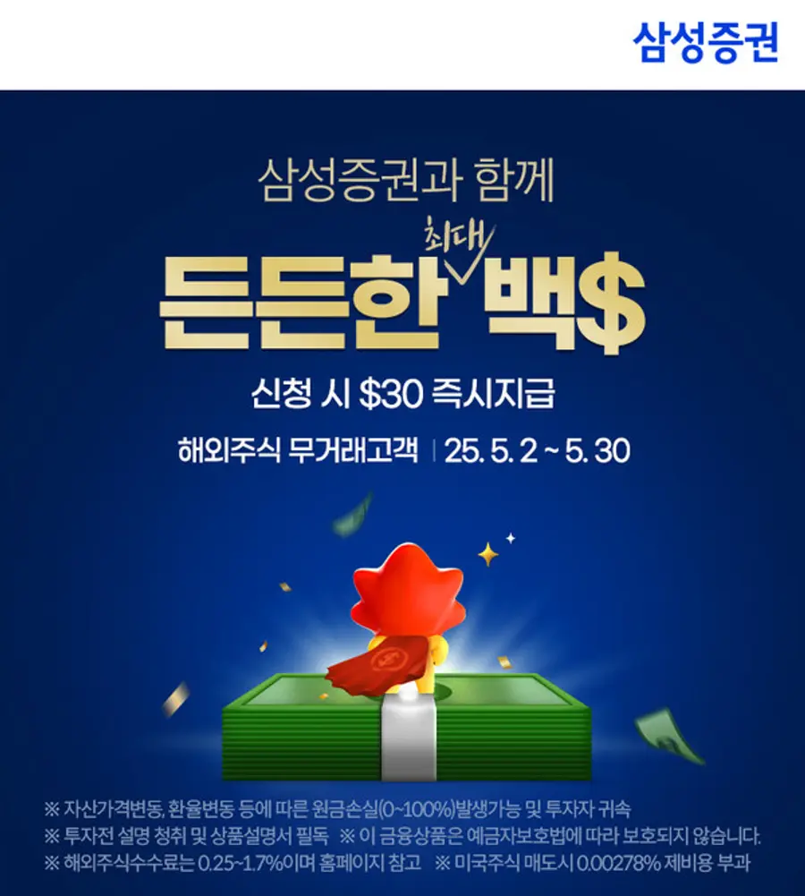 |스마트투데이=김세형 기자| 삼성증권이 신규 고객 또는 2020년부터 삼성증권에서 해외주식 거래 경험이 없었던 고객을 대상으로 최대 100달러를 지원하는 이벤트를 진행한다고 19일 밝혔다.