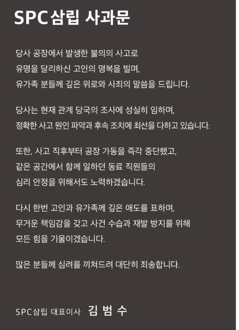 김범수 SPC삼립 대표이사는 사과문을 통해 "불의의 사고로 유명을 달리하신 고인의 명복을 빌며 유가족분들께 깊은 위로와 사죄의 말씀을 드린다"며 "고인과 유족께 깊은 애도를 표하며 무거운 책임감을 갖고 사건 수습과 재발 방지를 위해 모든 힘을 기울이겠다"고 밝혔다.