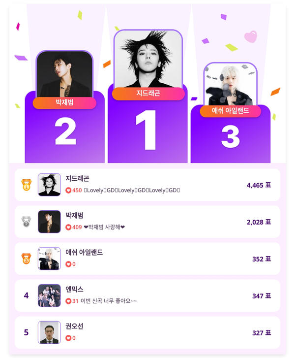 3위는 352표를 얻은 애쉬 아일랜드가 차지했다. 4위는 347표의 엔믹스, 5위는 327표의 권오선이 뒤를 이었다.