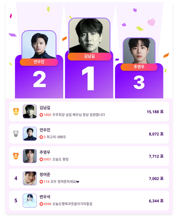 2위는 8,072표를 얻은 연우진이 차지했다. 그는 최근 개봉한 영화 '파과'에서 정극 연기를 선보이며 관객과 평단의 호평을 동시에 얻었다. 연우진은 이혜영, 김성철 등과 함께 감정 없는 킬러들의 대립 구조를 밀도 있게 이끌어가며 강렬한 인상을 남겼다. 팬들은 “연기의 깊이가 다르다”는 반응을 보이며 변함없는 애정을 드러냈다.