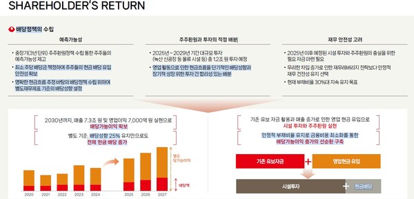 하지만 외형 성장과 달리 주주 환원 방안은 소극적이다. 최소 주당 배당금을 5000원으로 하고, 배당성향은 25%(별도기준)하겠다고 밝혔다.