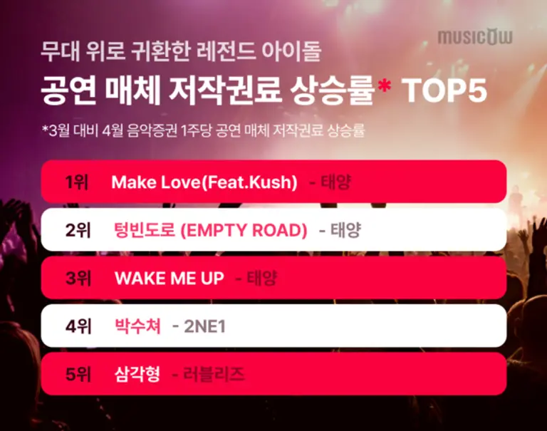 특히, 작년 하반기부터 올해 2월까지 월드투어를 성황리에 마친 가수 태양의 노래가 전월 대비 공연 매체 저작권료 상승률 1위부터 3위까지 차지해 눈길을 끈다. 재결합 소식을 알리며 오랜만에 콘서트를 진행했던 2NE1과 러블리즈의 노래도 높은 순위를 기록했다.