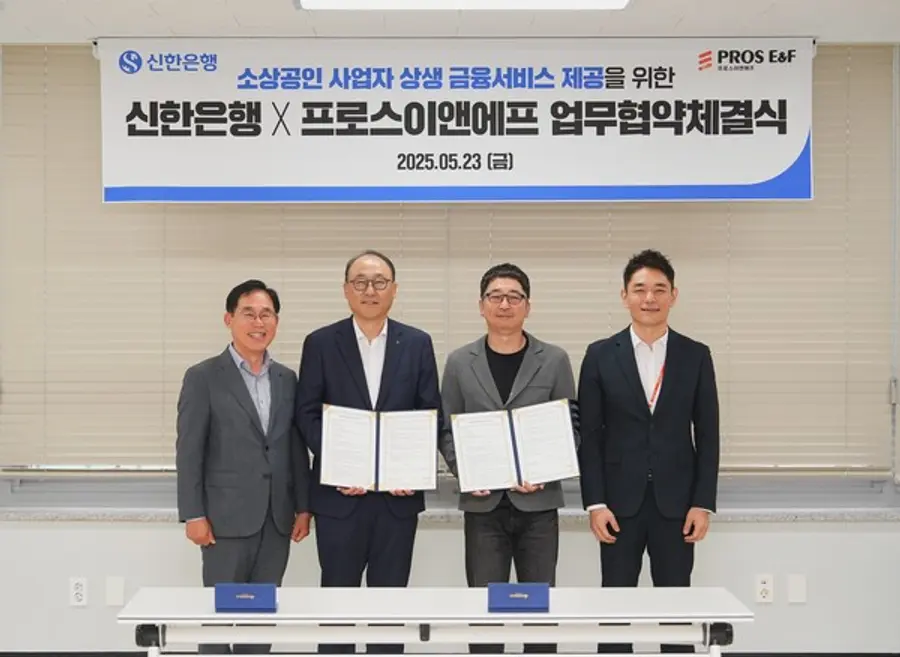 |스마트투데이=김윤진 기자| 신한은행(은행장 정상혁)은 23일 경기도 성남시 소재 프로스이앤에프 본사에서 프로스이앤에프(대표이사 안상우)와 함께 소상공인 상생 금융서비스 제공을 위한 업무협약을 체결했다.