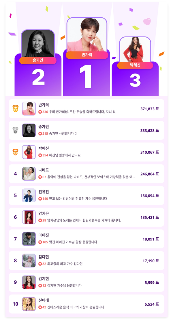 이번 투표는 중위권부터 상위권까지 치열한 순위 다툼이 펼쳐졌다. 특히 반가희의 1위 등극은 팬덤의 결집력과 최근 활약이 맞물린 결과로 해석된다. 반면 송가인과 박혜신은 고정 팬층의 탄탄함을 입증하며 꾸준히 상위권을 지켰다.