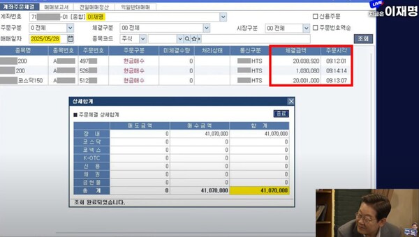 28일 이재명 후보의 유튜브 채널에 공개된 라이브 영상에서 이 후보는 자신의 주식 계좌를 인증했다. 프리마켓이 아닌 오전 9시 정규장 개장 직후 매입에 나선 것으로 보인다.