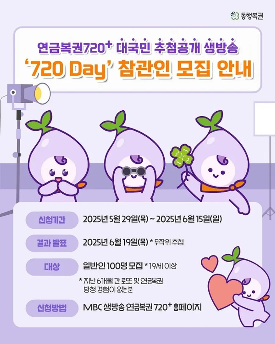 참관 신청은 오는 6월 15일까지 MBC 홈페이지를 통해 가능하며, 신청자 중 무작위 추첨을 통해 100명을 선정, 6월 19일 개별 안내될 예정이다. 참여 자격은 최근 6개월 내 로또복권, 연금복권 추첨 생방송 참관 경험이 없는 19세 이상 성인이다.
