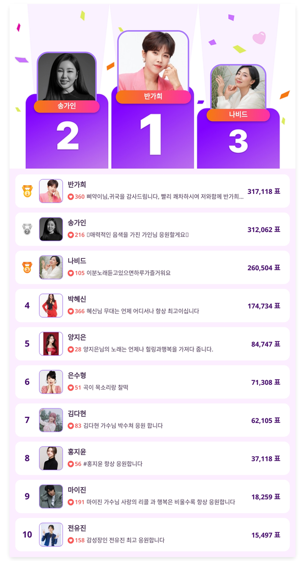 2위는 312,062표를 얻은 송가인이 차지했다. 독보적인 음색과 대중적인 인지도를 바탕으로 상위권을 꾸준히 지키고 있으며, 다양한 방송 활동을 통해 활약을 이어가고 있다.