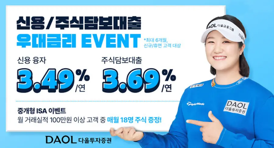 |스마트투데이=김윤진 기자| 다올투자증권이 3%대 금리혜택을 누릴 수 있는 ‘신용·주식담보대출 우대금리 이벤트’를 실시한다고 2일 전했다.