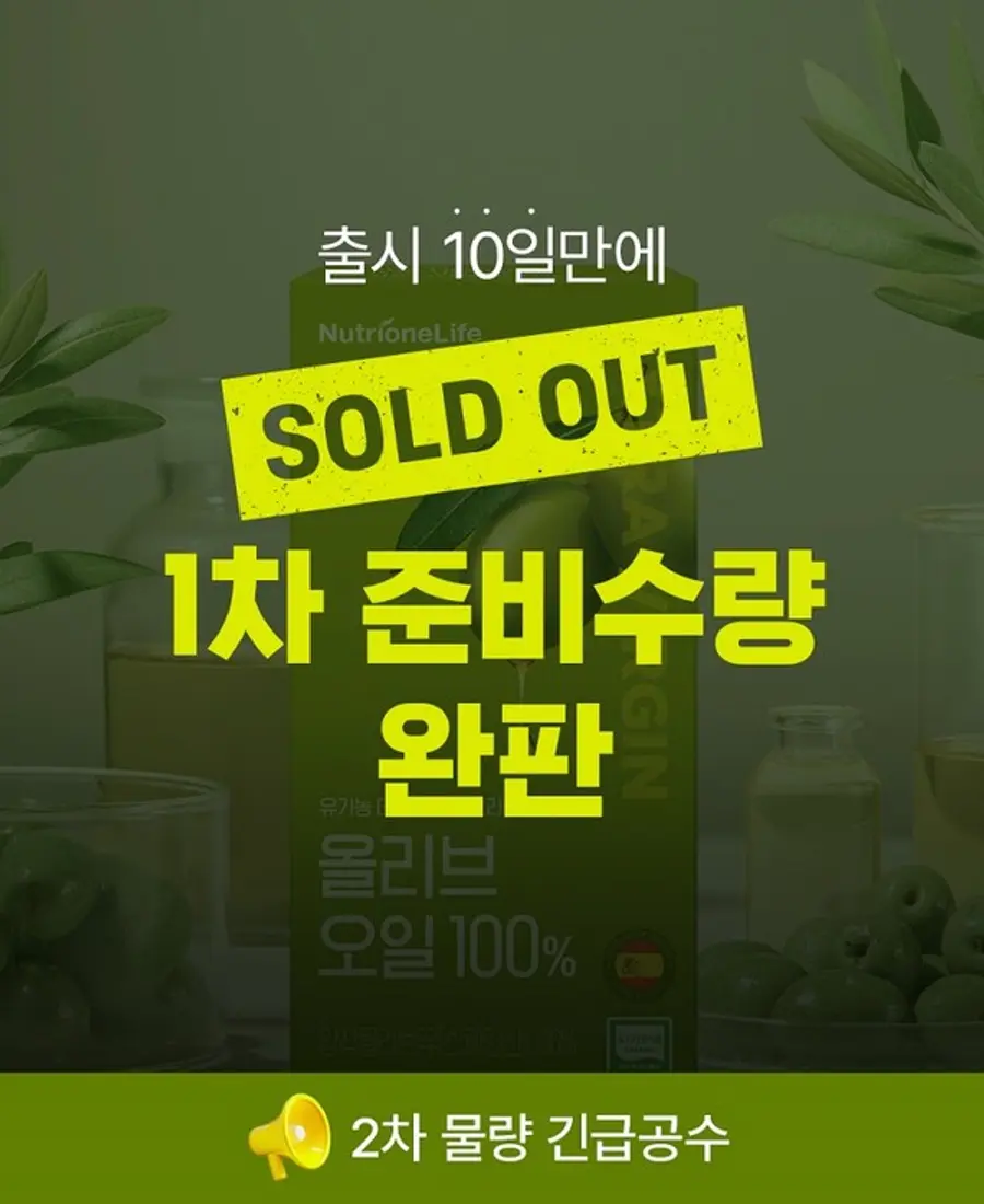 회사는 뉴트리원 스마트 스토어에서 판매 중인 ‘유기농 데일리 엑스트라버진 올리브 오일 100%’는 긴급 공수 물량 중 80% 이상이 소진돼 2차 완판에 임박했다고 밝혔다.