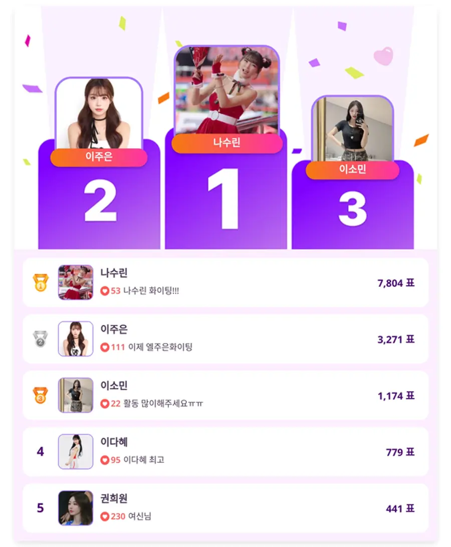 3위는 1,174표를 받은 이소민, 4위는 779표의 이다혜, 5위는 441표를 기록한 권희원이 각각 이름을 올렸다.