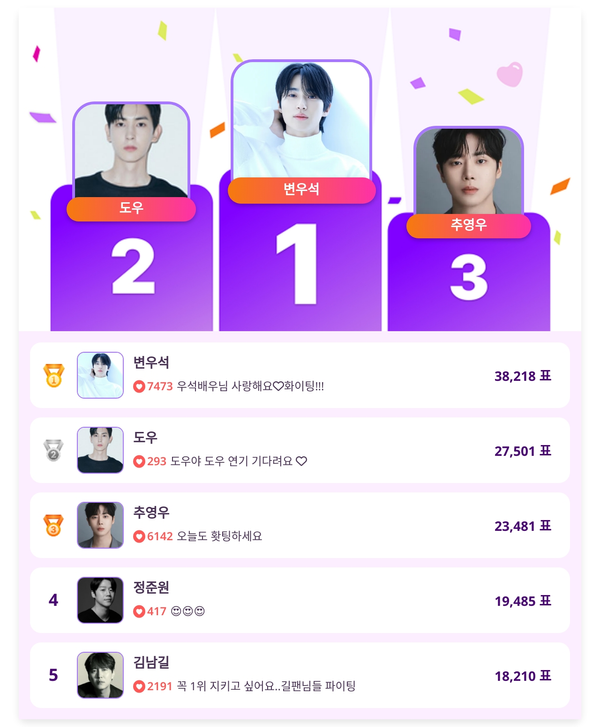 3위는 추영우로, 생일을 맞은 그를 향한 팬들의 뜨거운 축하와 응원이 23,481표라는 높은 득표로 이어졌다. “4위는 정준원(19,485표), 5위는 김남길(18,210표)이 차지했다.