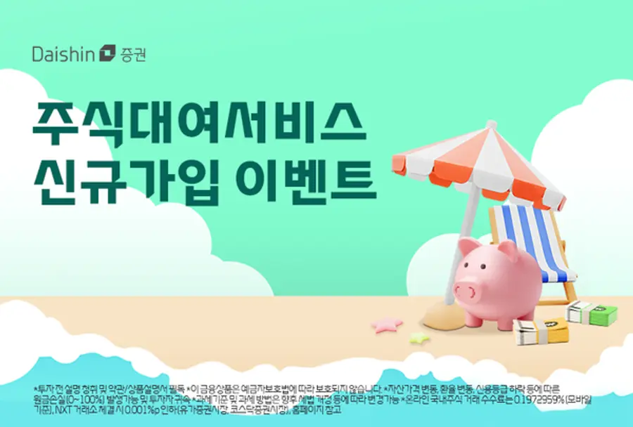 |스마트투데이=김윤진 기자| 대신증권은 주식대여 시 현금을 지급하는 ‘주식대여서비스 신규 가입 이벤트’를 진행한다고 5일 밝혔다.