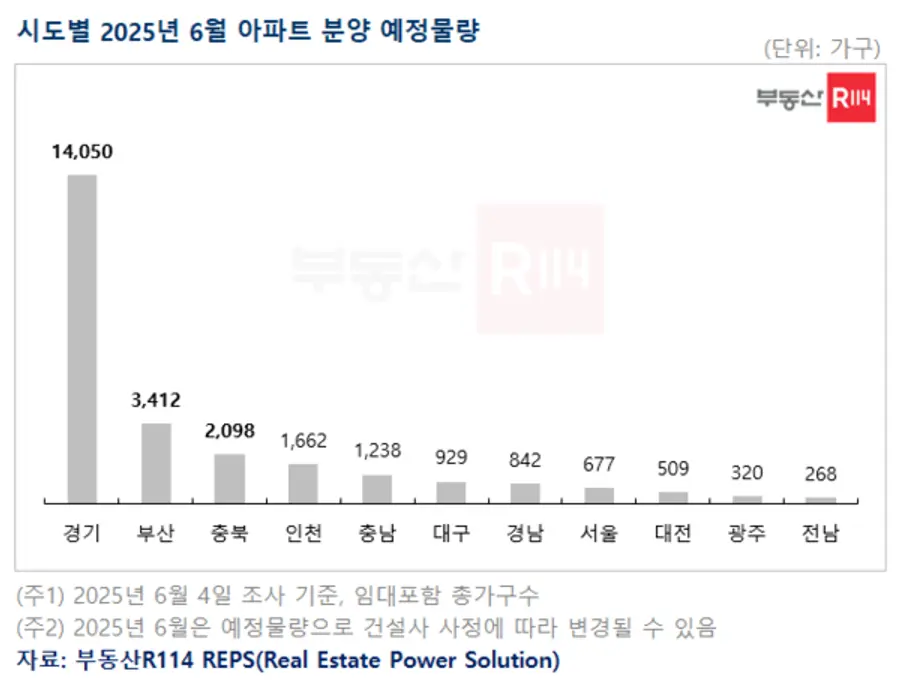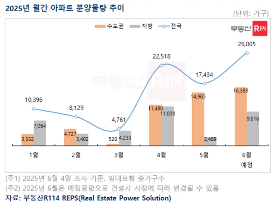 5일 부동산R114에 따르면, 6월 한 달 동안 전국에서 분양 예정인 총 가구 수는 2만6005가구(임대 포함)로, 이는 지난해 동기(1만6,000여 가구) 대비 약 1만 가구가 늘었다. 올해 1월부터 5월까지 중 가장 많은 월간 공급 물량이다.