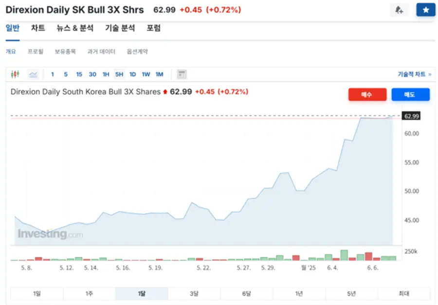 9일 증권업계에 따르면 한국 시간 9일 오후 1시4분 주간거래에서 티커명 KORU는 전 거래일보다 4.38% 급등한 65.28달러에 거래가 체결됐다.
