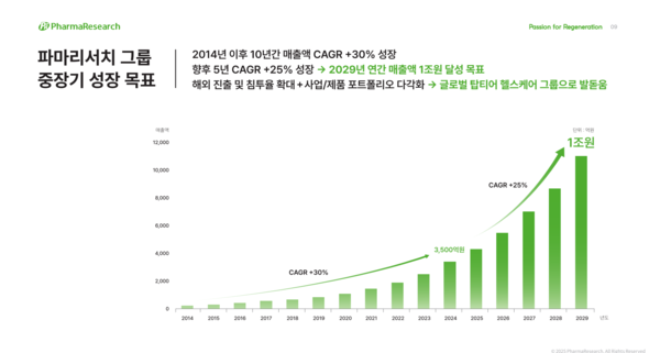 파마리서치는 그러면서 오는 2029년 연간 매출 1조원 달성 목표를 제시했다. 올해부터 향후 5년간 연평균 25%씩 성장한다. 파마리서치는 지난해 3500원의 매출을 올렸다. 이를 세 배 가까이 늘리겠다는 것이다.